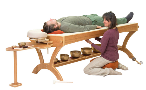 - Singing bowls can be placed on the crossbar under the couch, on the couch, or on the client to enhance the sound experience.