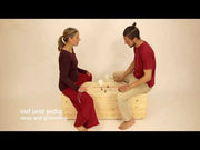 Playing surface on top. Two players sit at the two ends of the drum, where there are no reeds, and play the reeds that are now in front of them with the mallets. Slowly it starts, the exploration - the vibration is perceived in amazement in the body and quickly the shyness dissolves and a joyful interactive drumming starts, at first not necessarily musical - the counterpart wants to be known - but later joyful, cheeky, funny, refreshing. Creativity is awakened and rhythm as communication connects and enlivens.
