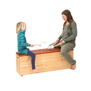 Playing surface on the side. The Bass-Tongue Drum is tilted on its side. The lid is on the side, and there is a blank pine side on top. This is padded with a blanket and a child or an adult is placed on it, when the lower legs at the end of the drum hang down, they can also be placed on top of the drum. A player (companion or educator - or an experienced, attentive child) sits next to the drum and gently strikes the individual sound tongues one after the other with a mallet. First you need to pay attention how the person is feeling, when the OK comes - then the slow, gentle drumming can begin. If you keep an eye on the breathing of the person lying down, you will recognize what is going on with the person and when to stop.